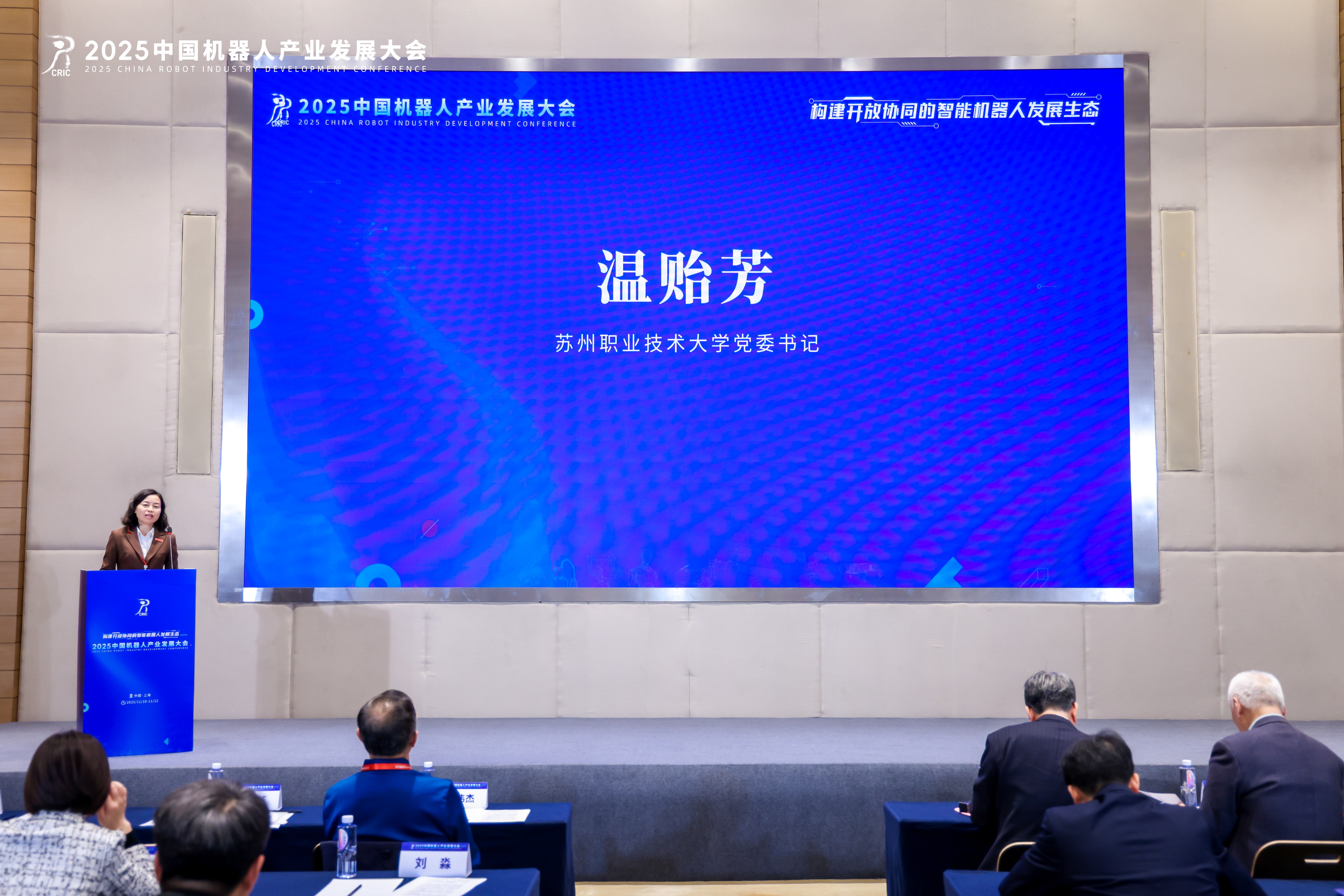 作为承办单位代表,温贻芳在致辞中指出,苏州职业技术大学作为具有百年职教传承的职业本科院校,始终秉持“与产业共生、与企业共进、与城市共发展”办学理念,她详细介绍了学校通过机器人与智能制造国家市域产教联合体在机器人产业人才培养和产教融合方面的努力与成果,并分享了未来对中国机器人产业人才工作的思考与展望,同时呼吁携手合作,共同推动机器人产业的高质量发展。