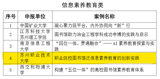 近年来,图书馆立足职业教育类型特点,系统构建了以“课程建设为基础、分层培训为抓手、品牌讲座为牵引、以赛促学为驱动、新媒体传播为延伸、创新素养培育为拓展”的泛信息素养教育体系,形成了具有鲜明职教特色的“苏职大模式”。该实践成果已相继获得全国高职院校图书馆馆长论坛案例二等奖、江苏高校图书馆发展创新案例等荣誉。在信息素养竞赛方面,累计荣获苏州市高校学术搜索挑战赛一等奖、江苏省高职高专院校信息素养大赛特等奖一等奖、全国高职高专院校信息素养大赛特等奖二等奖等各级奖项37项,充分彰显了图书馆在服务教学科研、助力学生成长方面的专业实力与创新活力。