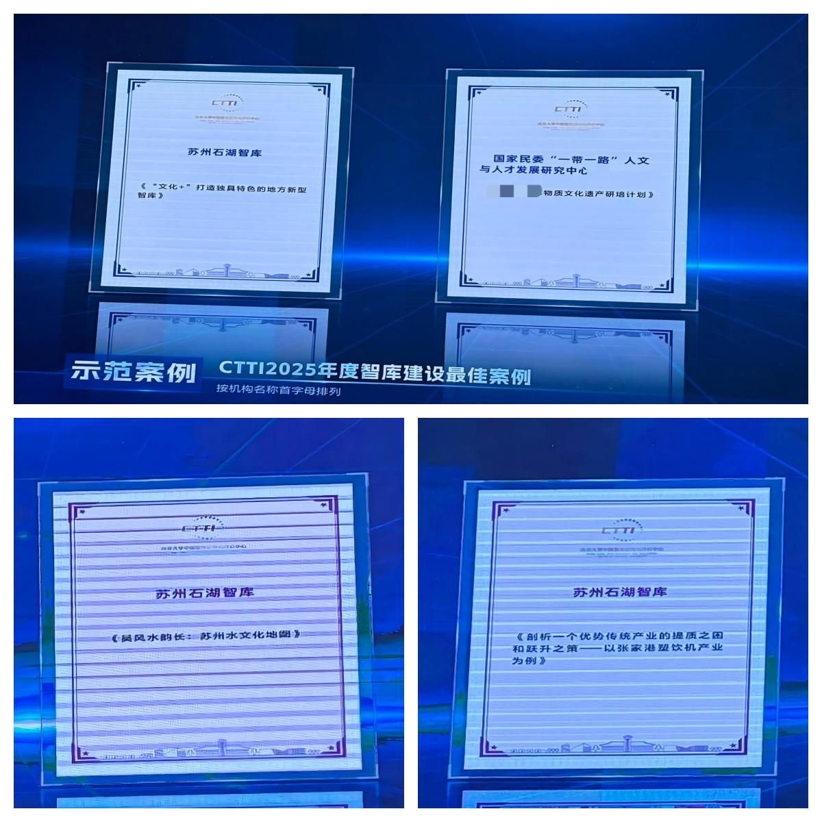 论坛发布了CTTI2025年度智库建设最佳案例和智库优秀成果,石湖智库申报的《“文化+”打造独具特色的地方新型智库》获评CTTI2025年度智库建设最佳案例示范案例;团队研究成果《吴风水韵长:苏州水文化地图》《剖析一个优势传统产业的提质之困和跃升之策——以张家港塑饮机产业为例》分获智库研究优秀成果一等奖、二等奖。这是我校石湖智库自2023年以来,连续第3年荣获CTTI智库建设最佳案例和优秀成果奖,彰显了智库在高质量发展道路上的持续创新力与影响力。截至2025年11月,在CTTI系统收录的810家高校智库中,我校石湖智库是唯一入选的高职院校智库。