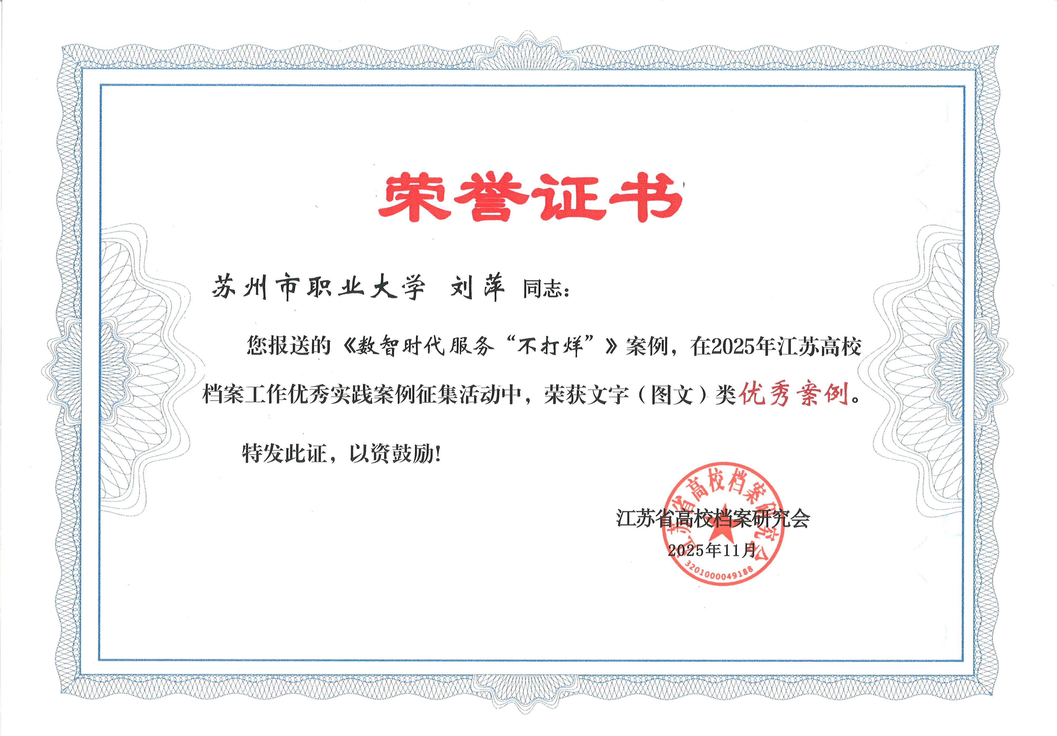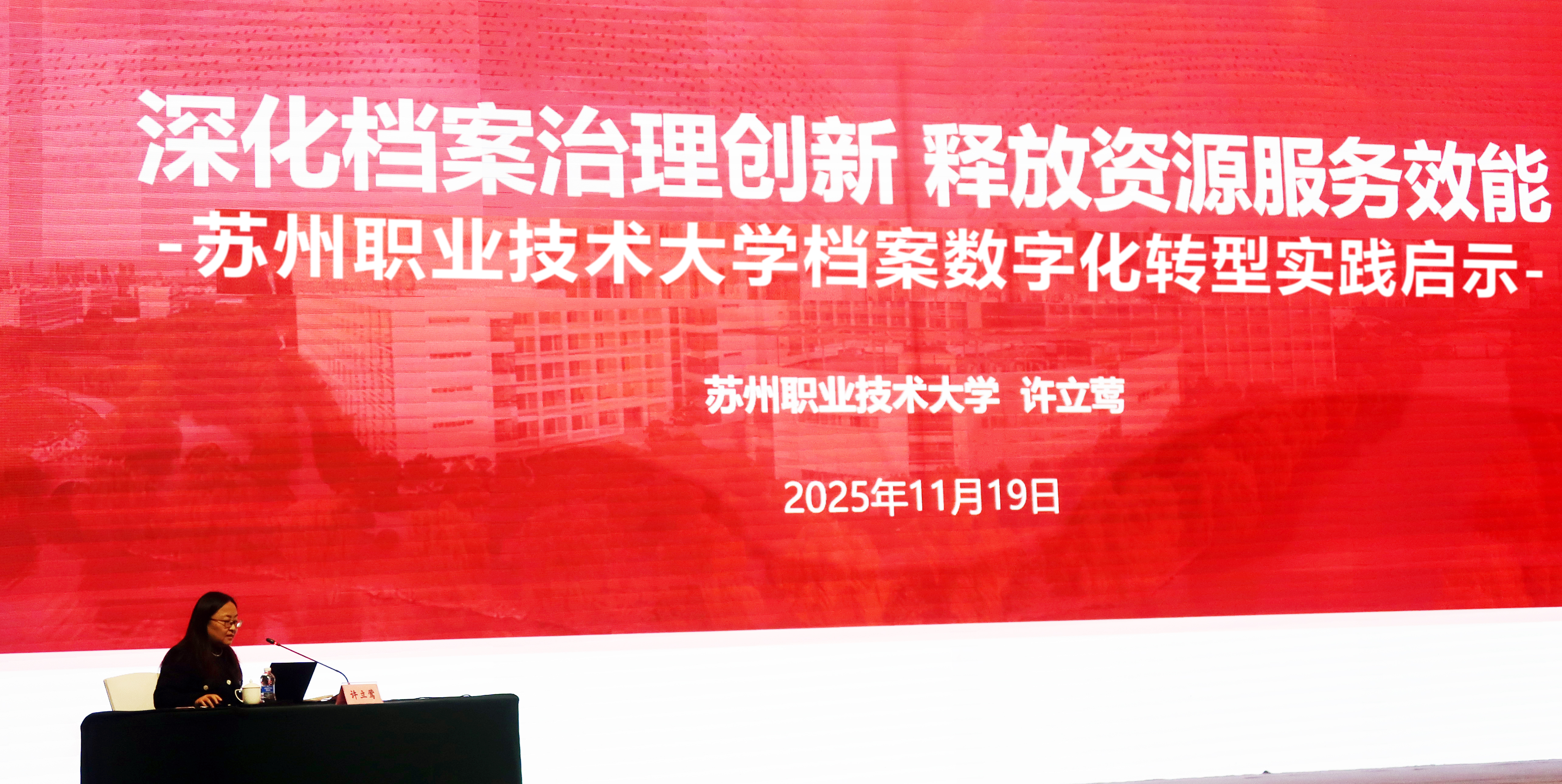 11月17日,江苏省高校档案研究会2025年学术年会暨十一届七次理事会议在常州召开。会上宣布了江苏高校档案工作优秀实践案例评审结果并举行颁奖仪式,学校档案馆副馆长许立莺申报的《深化档案治理 创新释放资源服务效能——苏州市职业大学档案数字化转型实践启示》获评“特色优秀案例”;刘萍申报的《数智时代 服务“不打烊”》获评“优秀案例”。