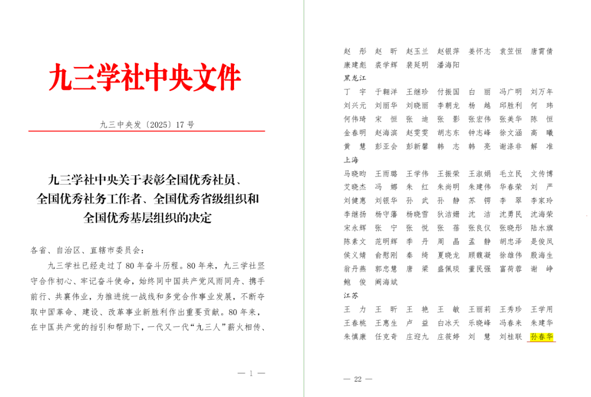 近日,在九三学社创建80周年之际,九三学社中央委员会发布《关于表彰全国优秀社员、全国优秀社务工作者、全国优秀省级组织和全国优秀基层组织的决定》(九三中央发〔2025〕17号),对作出突出贡献的集体与个人予以表彰。苏州市政协委员、九三学社苏州职业技术大学支社主委孙春华凭借突出表现,荣获九三学社中央“全国优秀社务工作者”称号,展现了我校民主党派成员良好的精神风貌和卓越贡献。