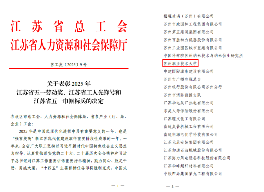 近日,江苏省总工会、江苏省人力资源和社会保障厅联合发文《关于表彰2025年江苏省五一劳动奖、江苏省工人先锋号和江苏省五一巾帼标兵的决定》(苏工发〔2025〕9号),对全省涌现出来的先进集体和先进个人进行表彰,我校被授予“江苏省五一劳动奖状”荣誉称号。