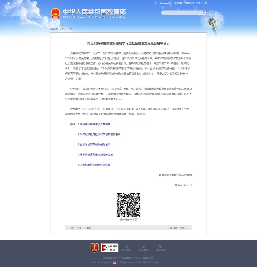 我校项目入选教育部第三批高等继续教育领域学习型社会建设重点任务