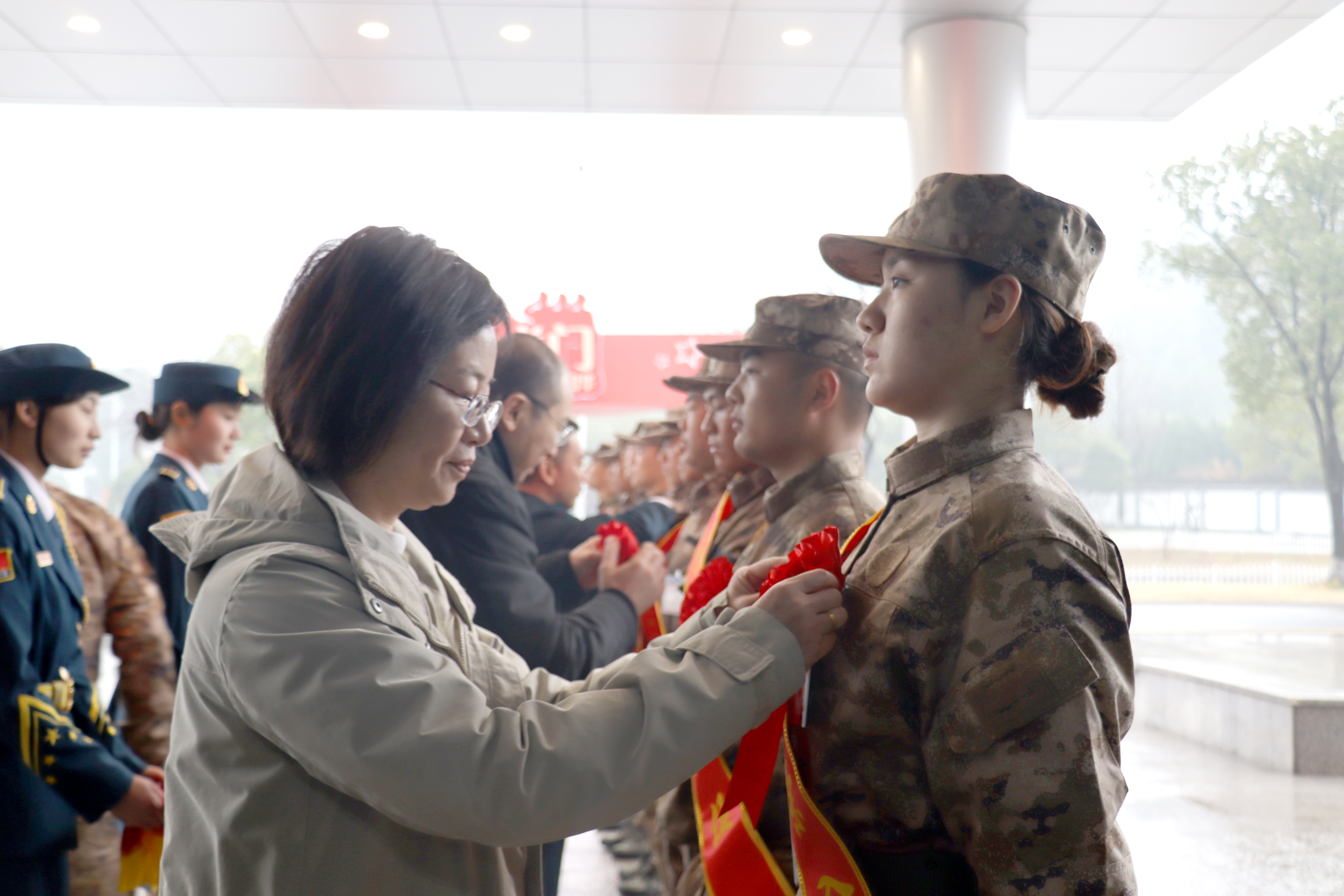 随后,张军与区人武部、校人武部及学院领导为新兵佩戴红花绶带、赠送慰问品,并合影留念。各学院负责人与新兵亲切交流,了解集训生活情况,鼓励他们坚定从军信念,早日成长为合格军人。