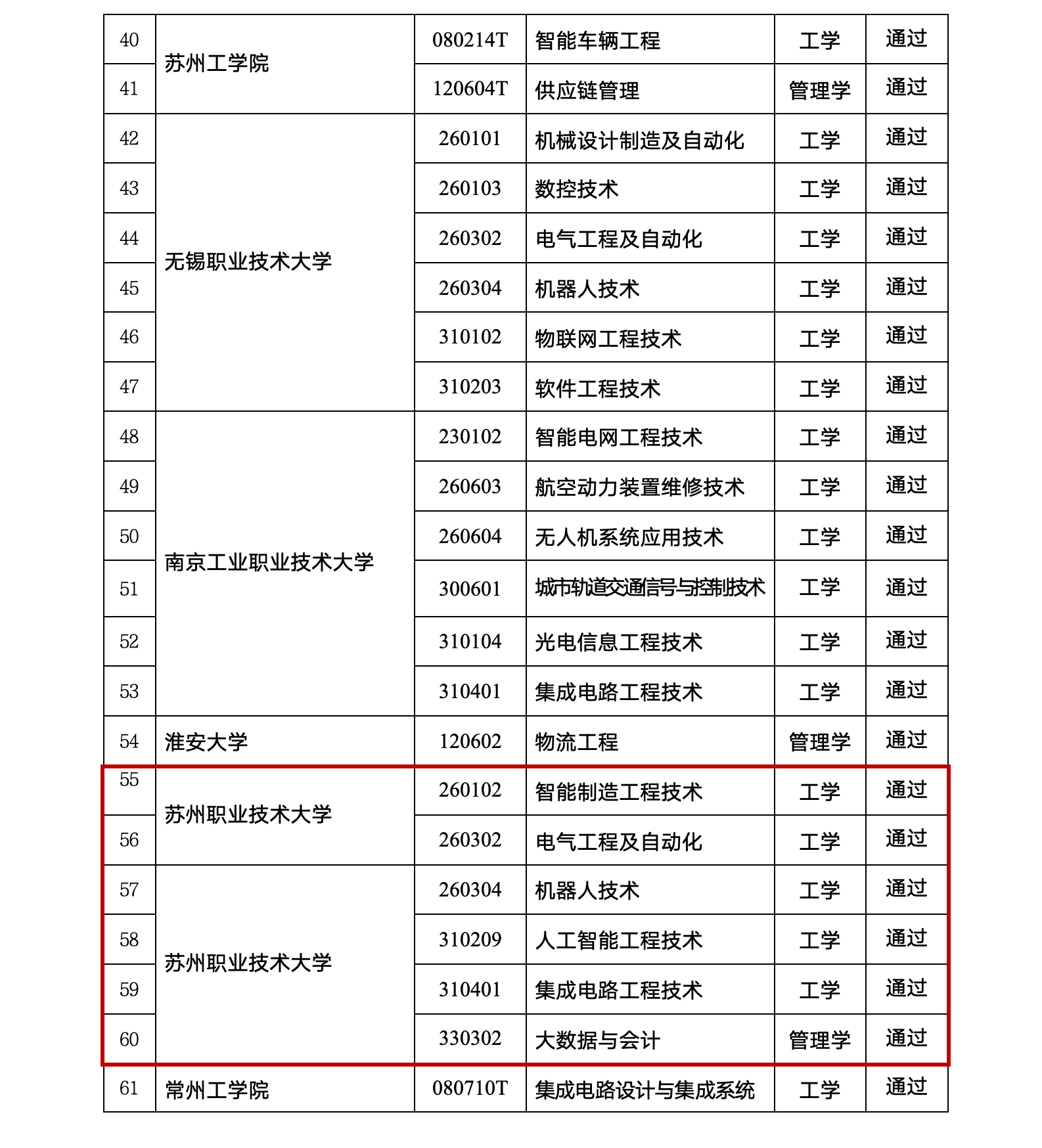 近日,江苏省学位委员会办公室发布《2026年江苏省学士学位授权专业审核结果公示》。经严格审核,我校首批设置的机器人技术、集成电路工程技术、电气工程及自动化、智能制造工程技术、人工智能工程技术、大数据与会计等6个职业本科专业全部顺利通过学士学位授权审核,正式获准增列为学士学位授权专业。我校为本次全省新增专业数量最多的职业本科院校之一,与南京工业职业技术大学、无锡职业技术大学并列第一。