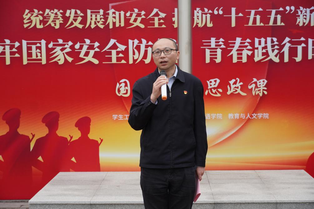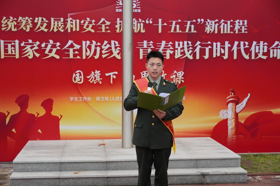 在第十一个全民国家安全教育日到来之际,为深入学习贯彻总体国家安全观,引导广大青年增强国家安全意识、勇担时代使命,4月15日清晨,我校在干将路校区举行国旗下的思政课暨“4·15全民国家安全教育日”主题活动。校党委委员、副校长张军出席并讲授思政课,相关职能部门负责人、二级学院党政负责人、辅导员、教师代表及2025级全体新生参加活动。