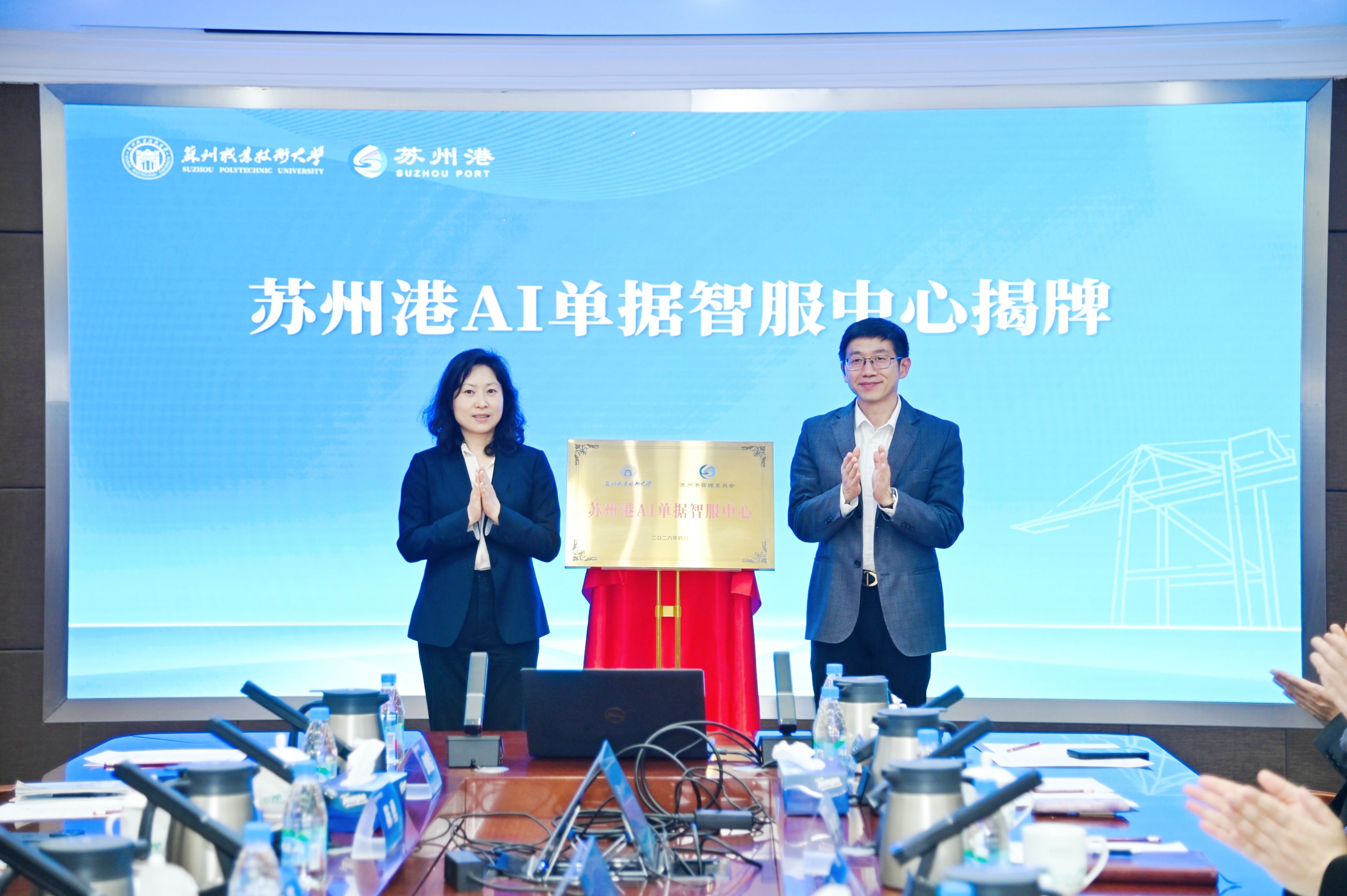 签约仪式后,周晓荷与陈峻共同为“苏州港AI单据智服中心”揭牌。