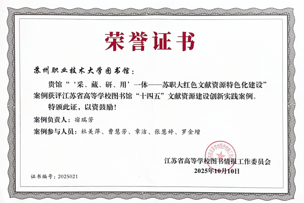 近日,江苏省高等学校图书馆“十四五”文献资源建设创新实践案例遴选结果公布,我校图书馆申报的《“采、藏、研、用”一体—— 苏职大红色文献资源特色化建设》案例,凭借鲜明的特色定位、系统的建设模式与显著的应用成效成功入选。